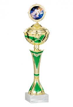 COUPE - 5 Hauteurs : 32 cm - 34 cm - 36 cm - 39 cm - 42 cm - - Coupelle et Couvercle en métal - Pied & Inter : ABS métallisé - Base en marbre - Finition :Or & Vert - Personnalisation : Choisir votre activité après étape 1 - Grand choix de disciplines disponibles - Pastille Ø 50mm : collée sans supplément