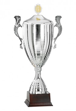 COUPE - 4 Hauteurs : 63cm - 66cm - 73cm - 78cm - Coupelle et anses en métal - Couvercle en métal - Pied de coupe en métal - Base : Bois vernis - Finition : Tout Argent - Personnalisation : Choisir votre activité après étape 1 - Grand choix de disciplines disponibles - Pastille Ø 50mm : collée sans supplément