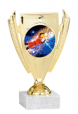 TROPHÉE PORTE-MÉDAILLE - Hauteur : 19 cm - Matière trophée : ABS métallisé - Base : Marbre Blanc - Finition : Argent et Or - Pastille Dorée ou en couleur, collée sans supplément - Grand choix de disciplines disponibles - Personnalisation : Choisir votre activité ou votre Logo après étape 1