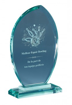 TROPHÉE - 3 tailles : 19 x 24 cm - 21 x 27 cm - 23 x 30 cm - Matière du trophée : Verre épaisseur 20 mm - Finition : Trophée et base en cristal jade - Personnalisation après étape 1 : Choisir votre activité ou importer votre propre logo (suppl. 50 ) - Gravure laser gratuite : logo et texte jusqu'à 40 caractères puis 0.05 le caractère suppl.)