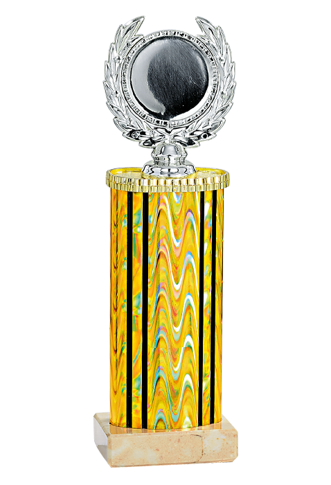 TROPHÉE PORTE-MÉDAILLE - Hauteur : 27 cm - Matière trophée : ABS métallisé - Base : Marbre Blanc - Finitions : Argent et Or - Pastille Dorée ou en couleur, collée sans supplément - Grand choix de disciplines disponibles - Personnalisation : Choisir votre activité ou votre Logo après étape 1