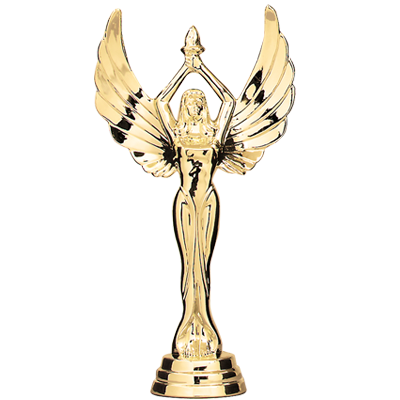 TROPHÉE – 3 Hauteurs : 20cm / 22cm / 24cm - Matière du trophée : Bois bicolore - Matière du socle : Bois vernis - Sujet NJ en résine, finition or et argent