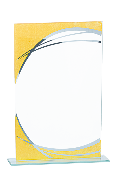 TROPHÉE – 3 Hauteurs : 19cm / 21cm / 23cm - Matière du trophée : Verre transparent avec partie dorée et lignes argentées - Matière du socle : Verre transparent - Sujet BJ en bois impression couleur